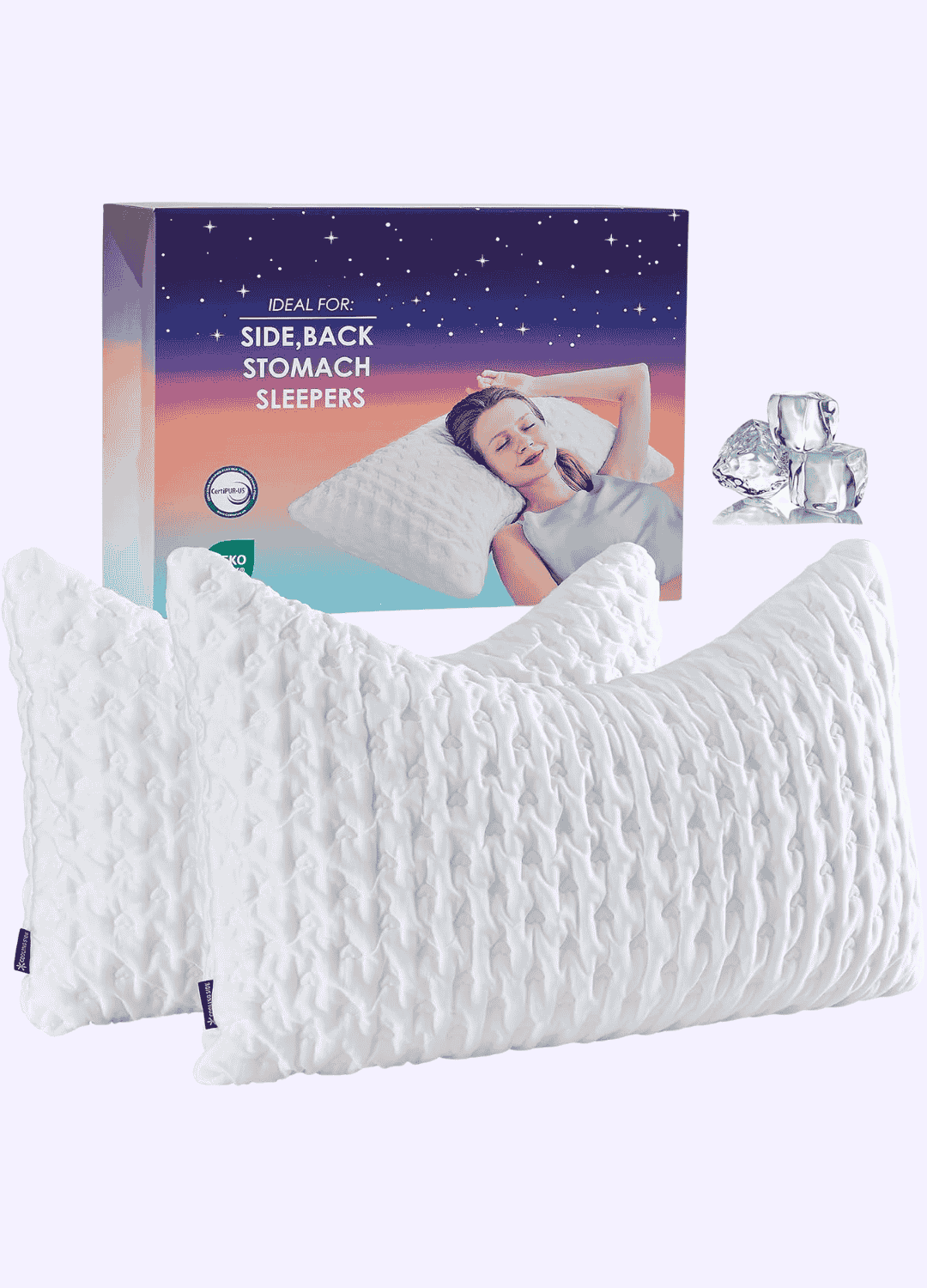 Adjustable shredded memory foam pillow set with cooling ice silk and bamboo covers. Contours to head and neck, maintains alignment, and delivers long-lasting comfort for a restful night.